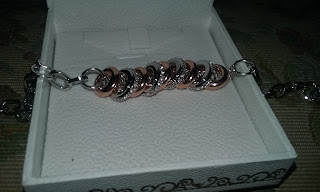Ho ricevuto nei tempi previsti ed in perfette condizioni questo splendido bracciale. Composto da una catenina con nove cerchi placcati in oro rosa e oro bianco. La catenina è in lega di zinco, senza nichel. Ha una chiusura che permette di personalizzare la lunghezza del bracciale secondo la misura del nostro polso. Viene spedito in una scatolina bianca, molto elegante. Inoltre, il bracciale ha dei brillantini che alla luce del sole brillano. Ho apprezzato molto questo bracciale, perchè grazie alla sua chiusura mi sta bene, visto che io ho il polso molto piccolo è difficile che trovi dei bracciali che mi stanno bene, perchè mi stanno larghi, ma questo è perfetto. Consiglio l'acquisto.